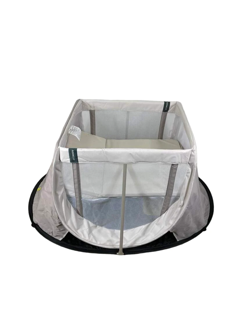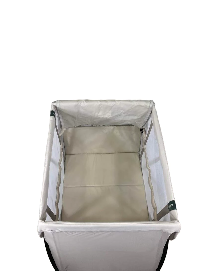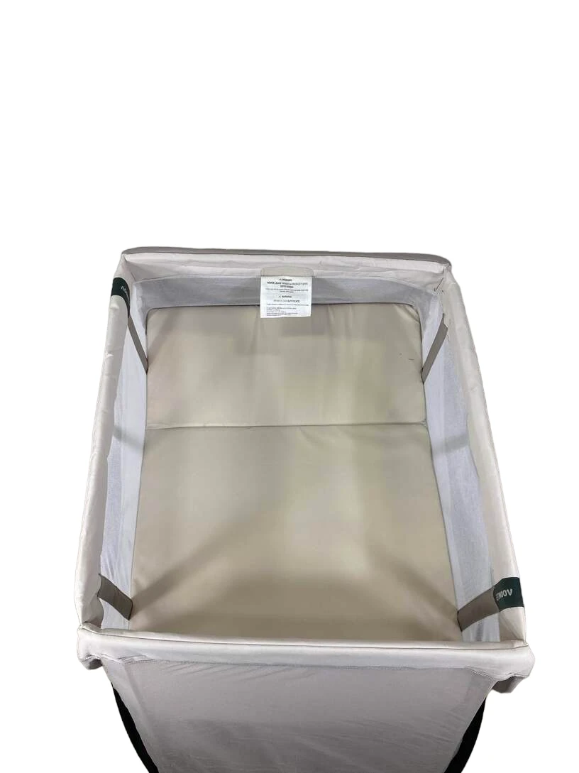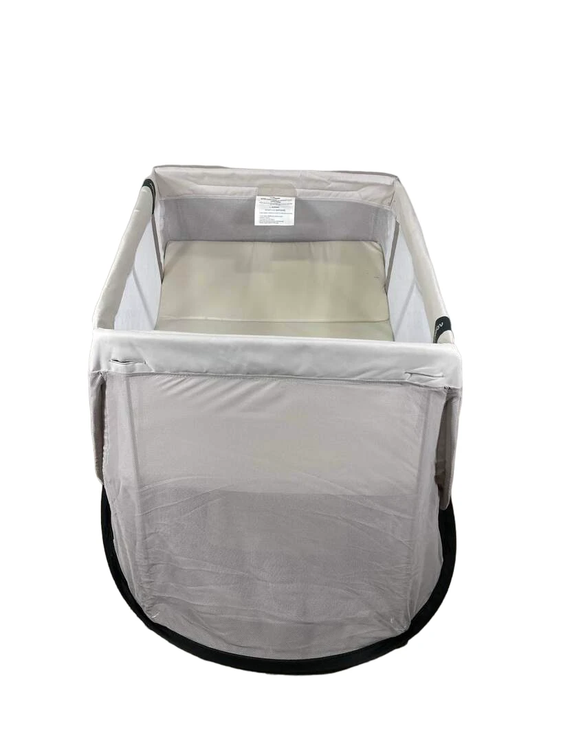 “This instant travel cot and playard is easy to take on the go with you everywhere! This playard can be ready in just two seconds, weighs under 11 pounds, and is overnight sleep approved. With an easy to clean mattress and included carry bag, this spacing saving cot is perfectly for baby.”