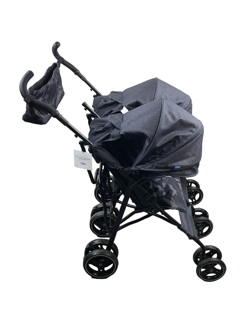“All the features of the classic BabyGap stroller that allows your little ones to sit side by side. Fabrics made from recycled materials with 2 large extendable canopies and parent organizer.”
