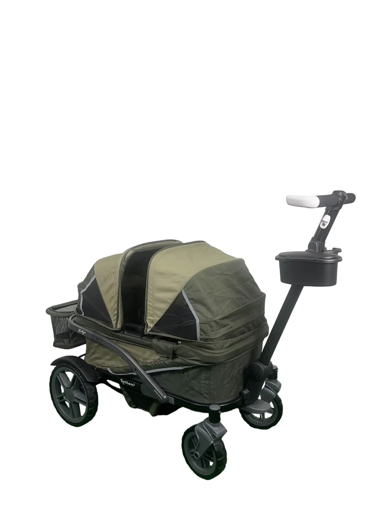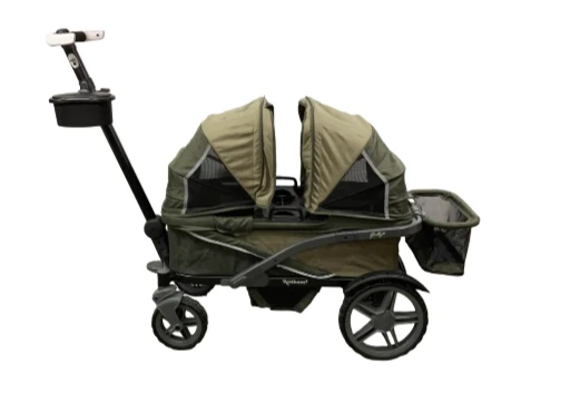“This top of the line wagon stroller seats 2 children, has an interior mattress, and plenty of excess storage! Built sturdy for easy cruising for anywhere you want to go! This model does not accept an infant car seat. Comes with 2 XL Water-resistant Canopies, Parent Cup Holder & Storage Case, Removable storage basket, Child Snack Tray for 2 with Child Cupholders, Stowaway Lounge Pad with Carry Bag, Interior Storage Pockets, Insulated Cooler Bag with room for 12 cans, Mosquito Net, Travel/Storage Bag.”