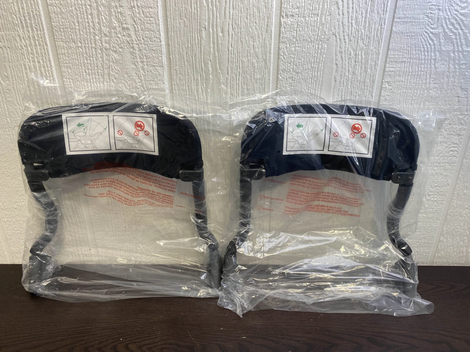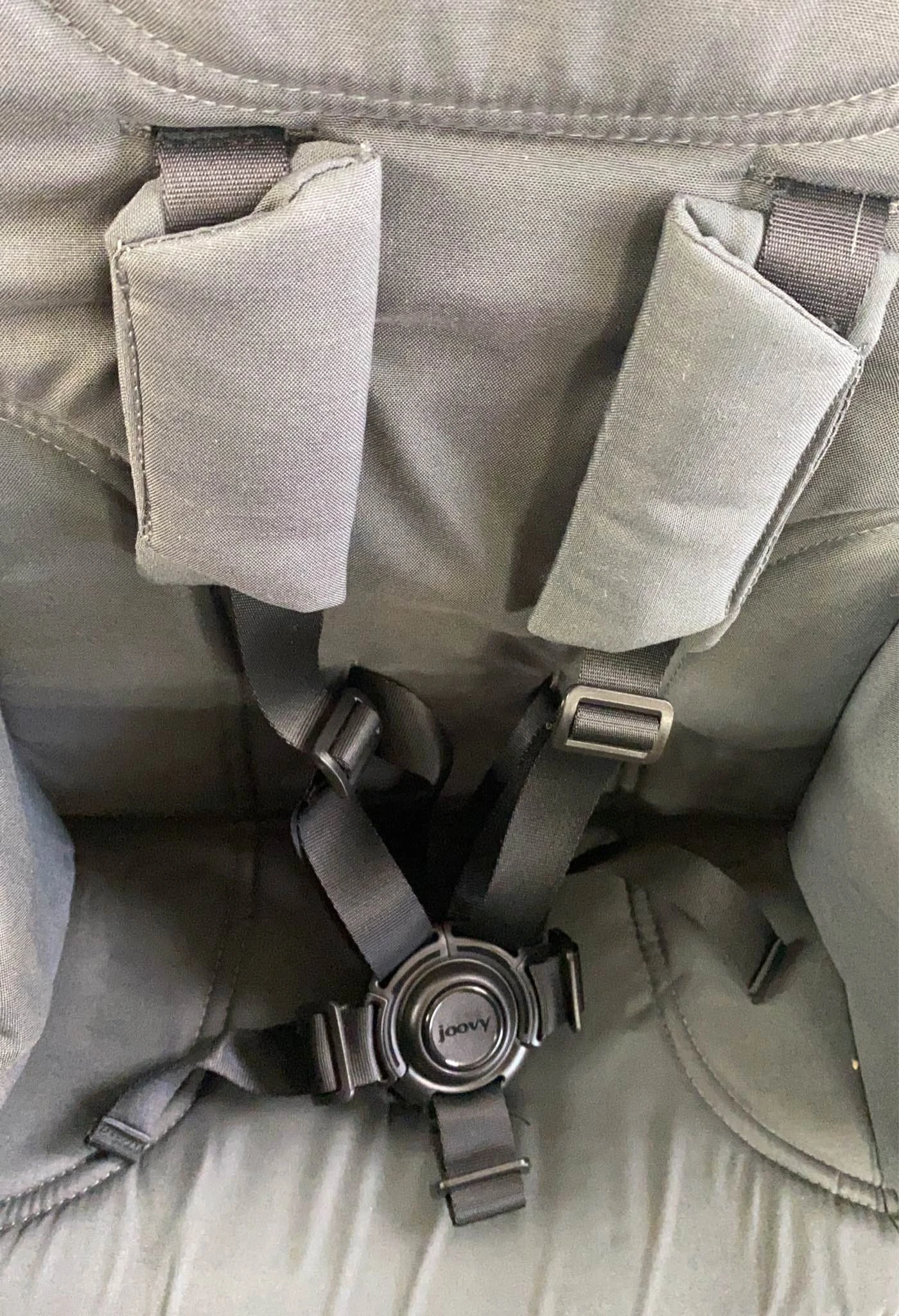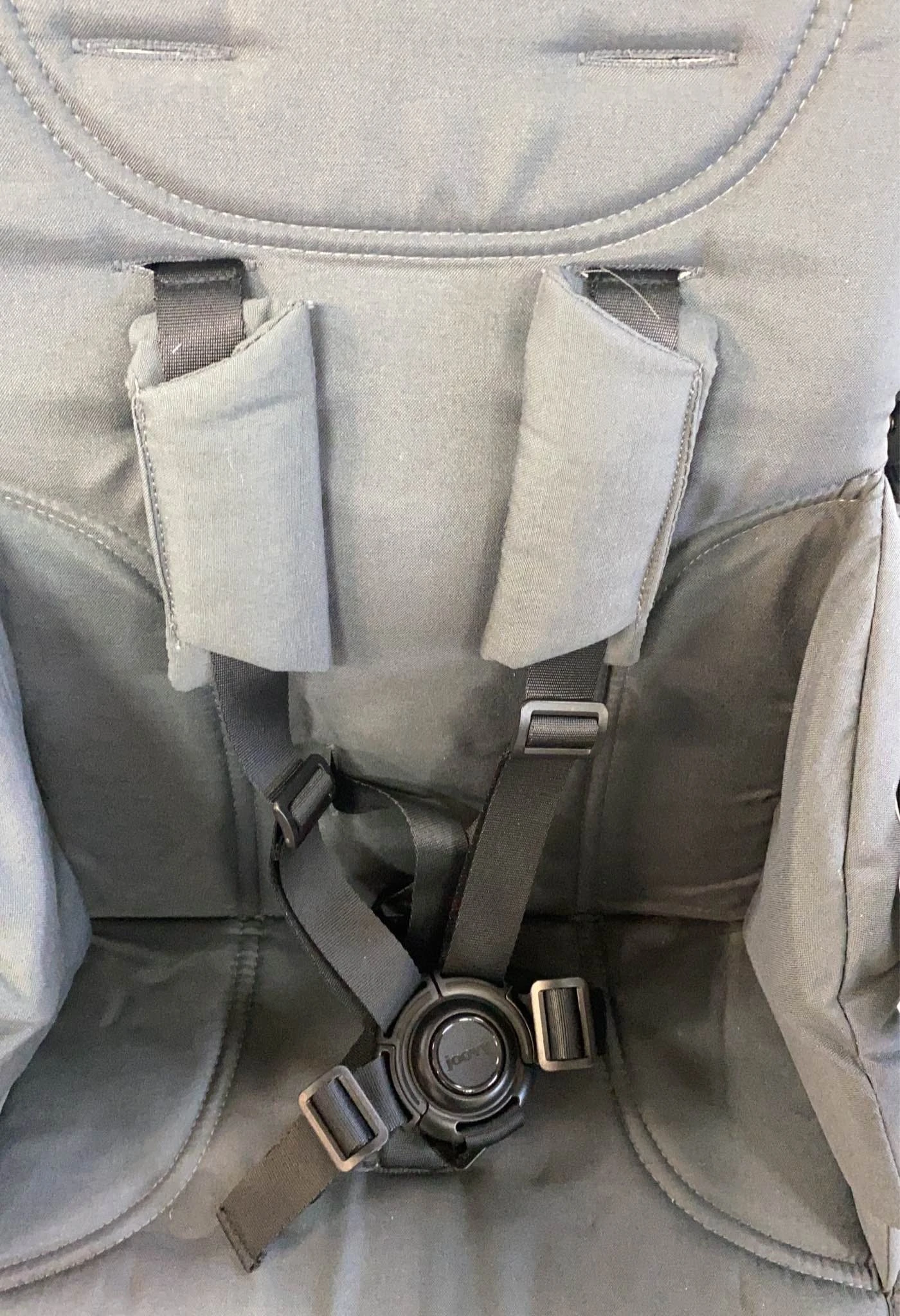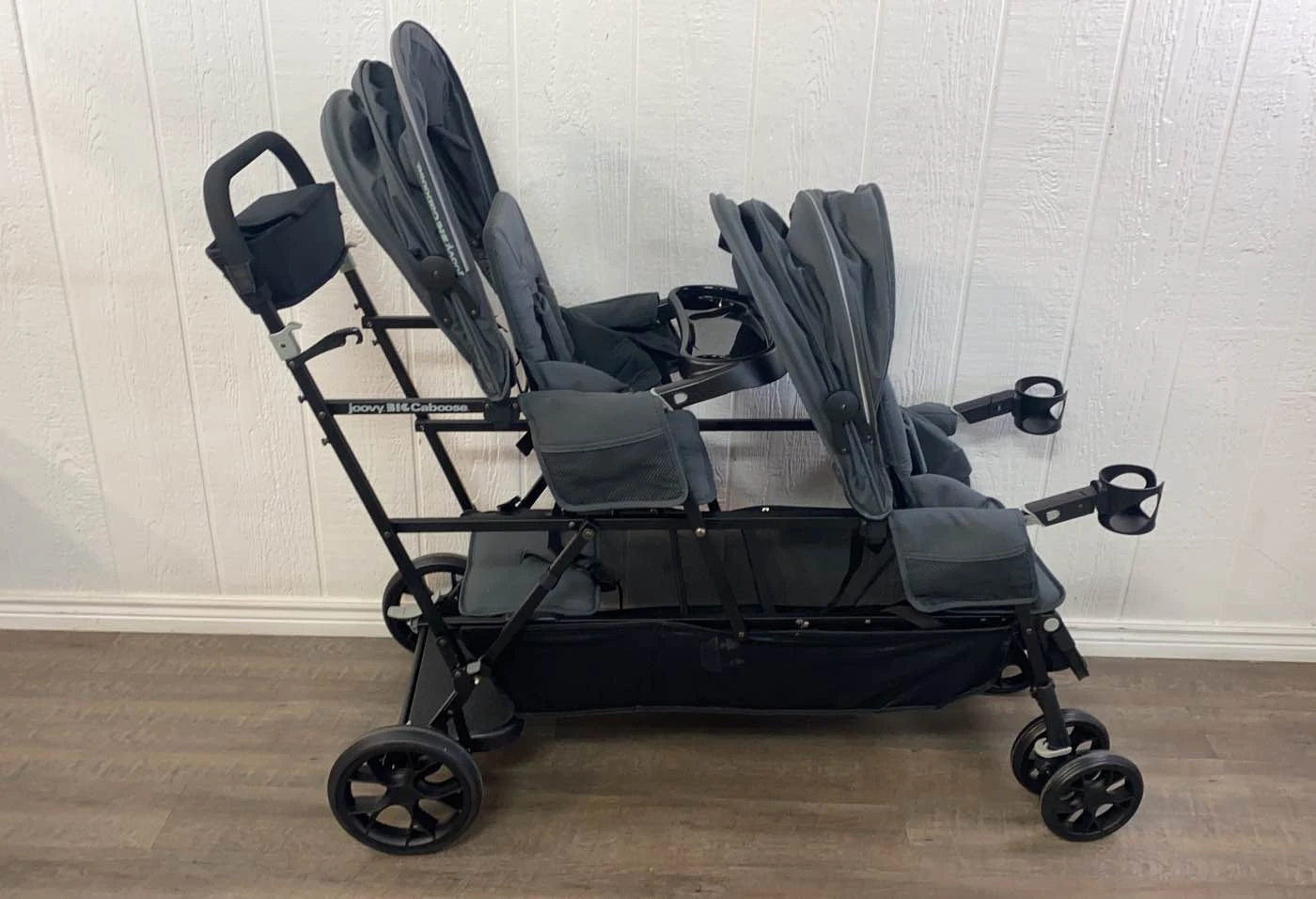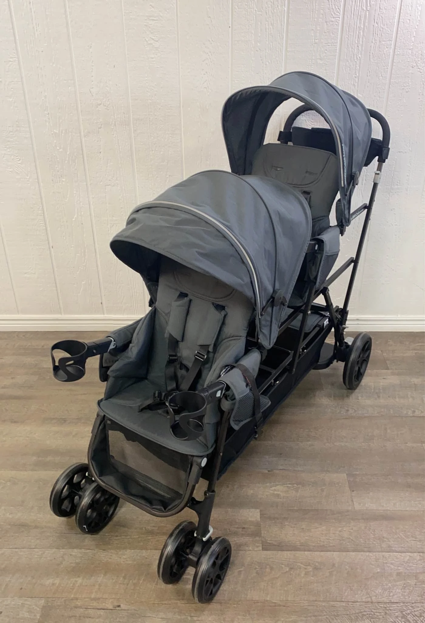 “Versatile stroller that is perfect for 3 children of varying ages. Includes two universal car seat adapters and two snack trays. There is plenty of space for two children to sit while a third older child can sit or stand in the back. This stroller also features a huge storage basket under the seats. “