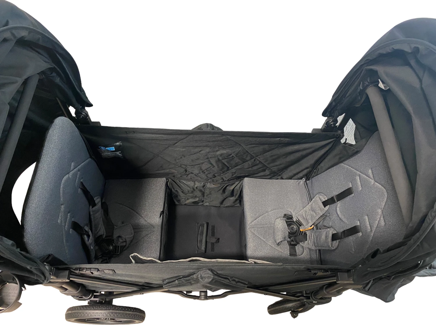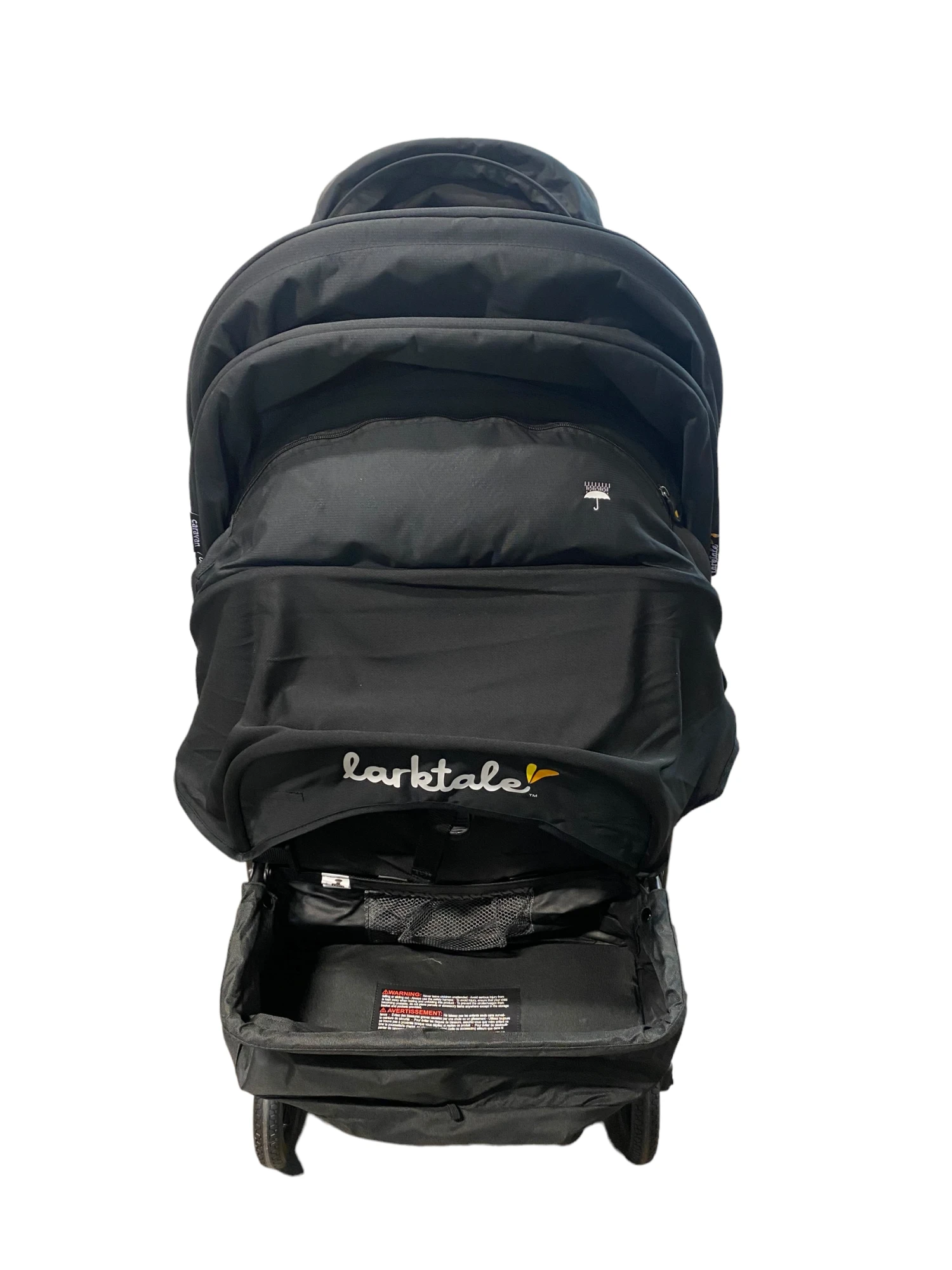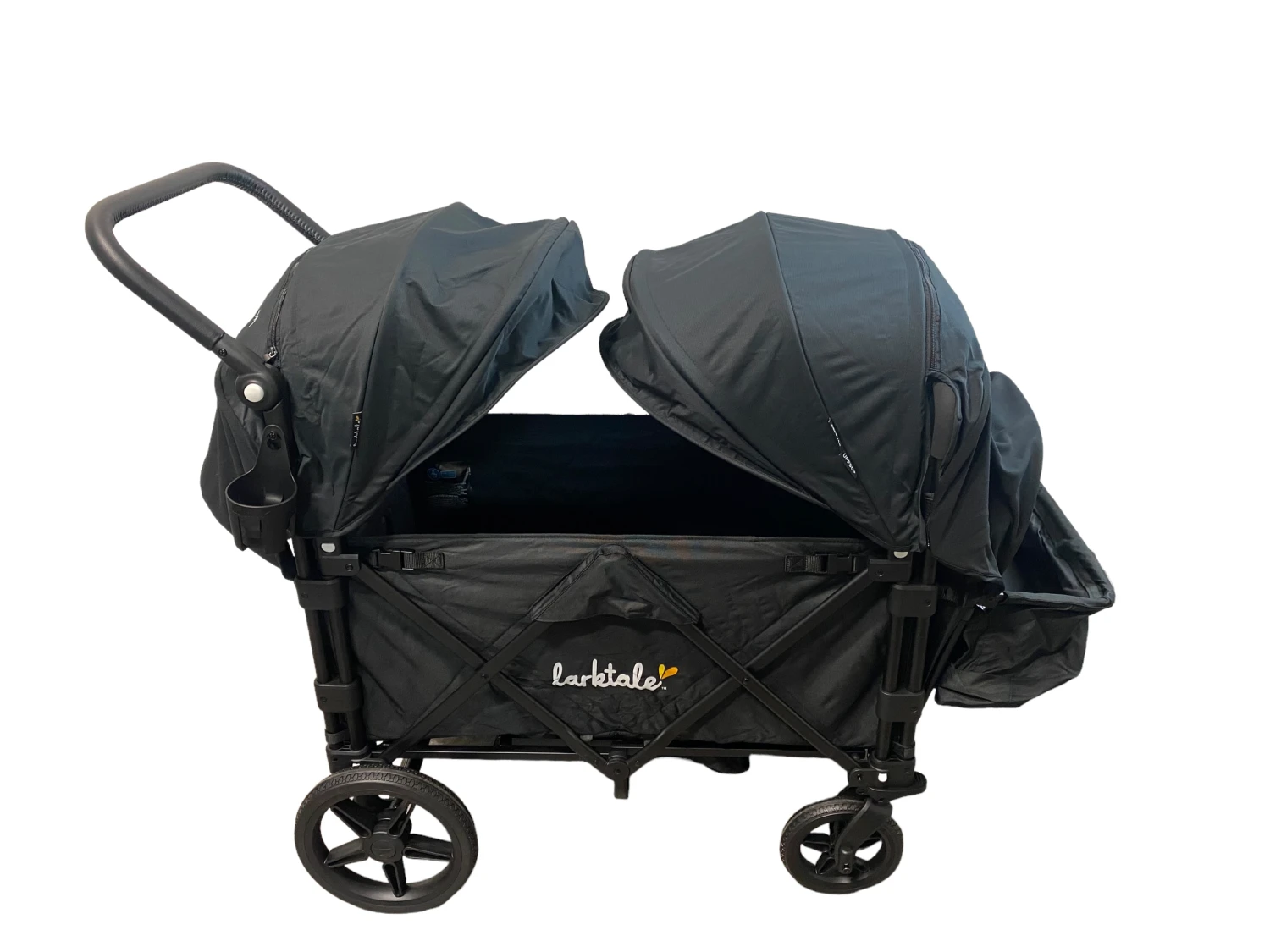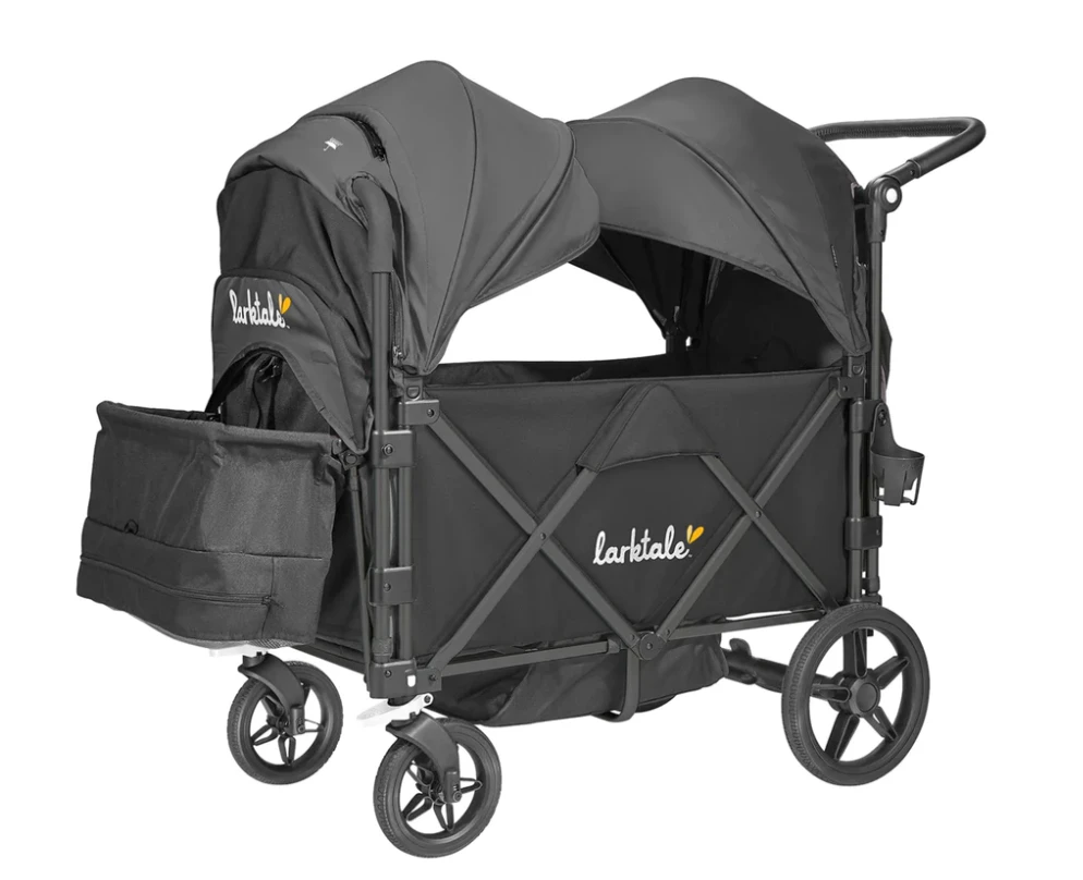 “meta charset=”utf-8”>This two seater stroller wagon is designed for children 6 months and up and holds up to 100 lbs (50 lbs per seat). It features easy amazing maneuverability, 5 point harnesses, all terrain tires, an easy fold, pockets, a zippered compartment and a cup holder. 42 Inches (H) x 25 Inches (W) x 61 Inches (D) Includes both canopies.”