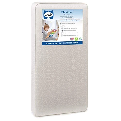 “The Sealy Baby FlexCool 2-Stage Crib Mattress provides your little one with premium comfort! This innovative waterproof mattress features a firm side for infants, as well as a cushioned side for toddlers.”