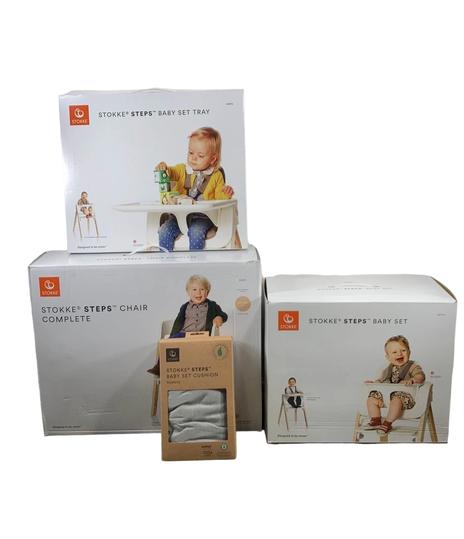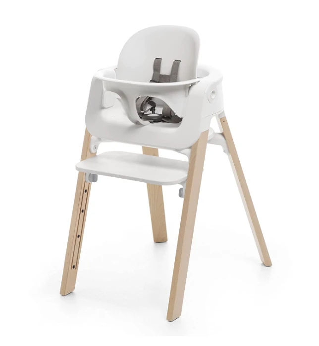 “The Steps Chair is part of a seating system that does it all! It is easy to clean and grows with your child in so many ways. Use it as a convenient stand for the Stokke Steps Bouncer or with the Baby Set to create a comfortable high chair. The chair itself is perfect for toddlers and preschoolers who are ready to climb in and out on their own. Family dinners are so beneficial for children. Why not include your little one at the family table from the very Start? This complete includes baby set with cushion and tray.”