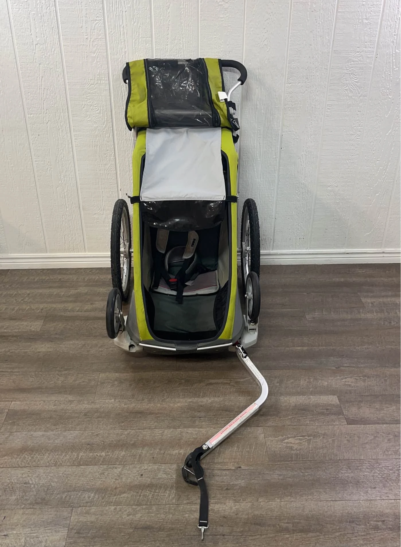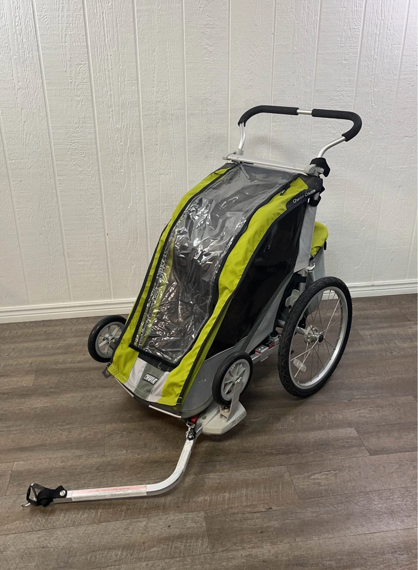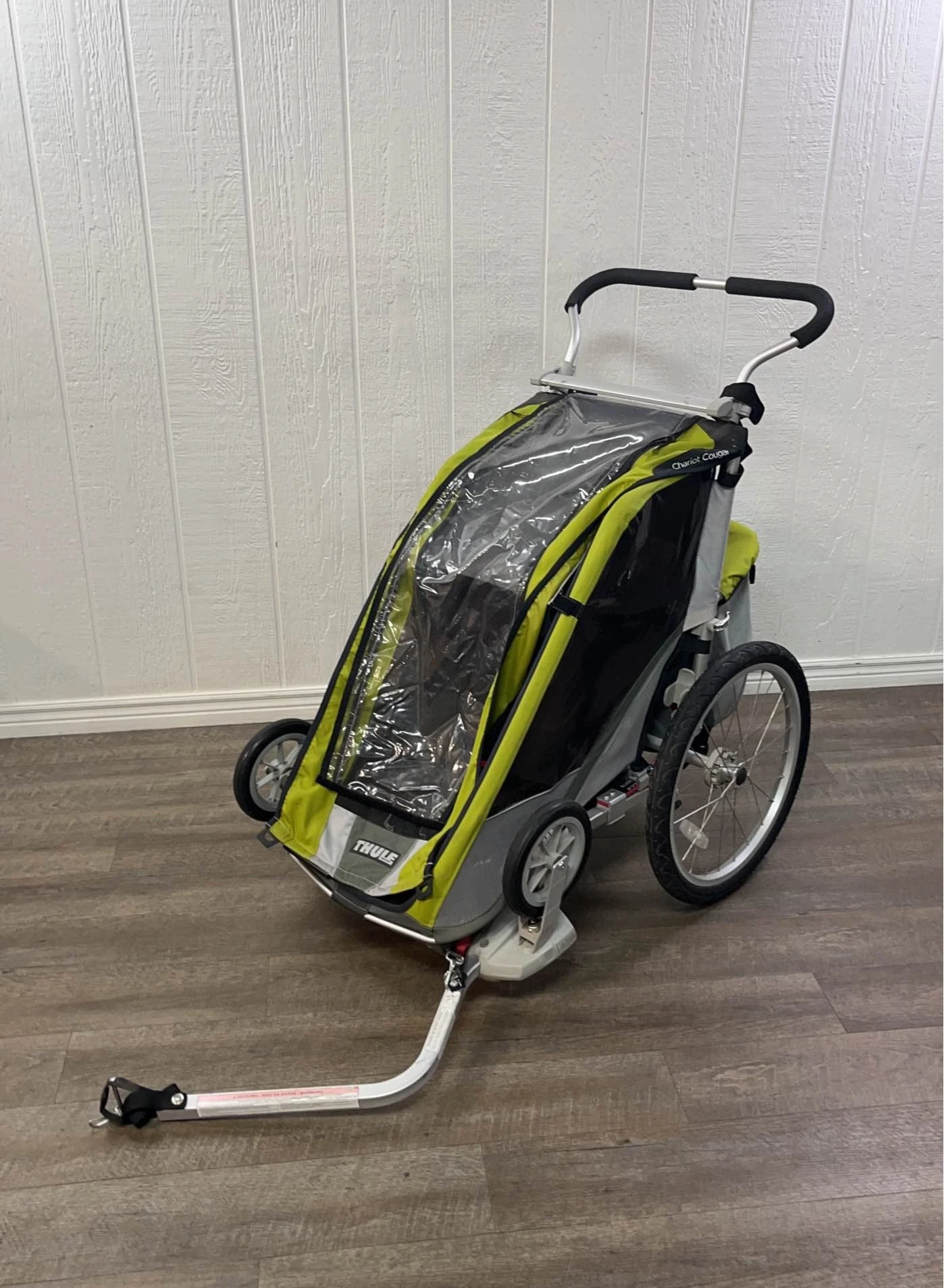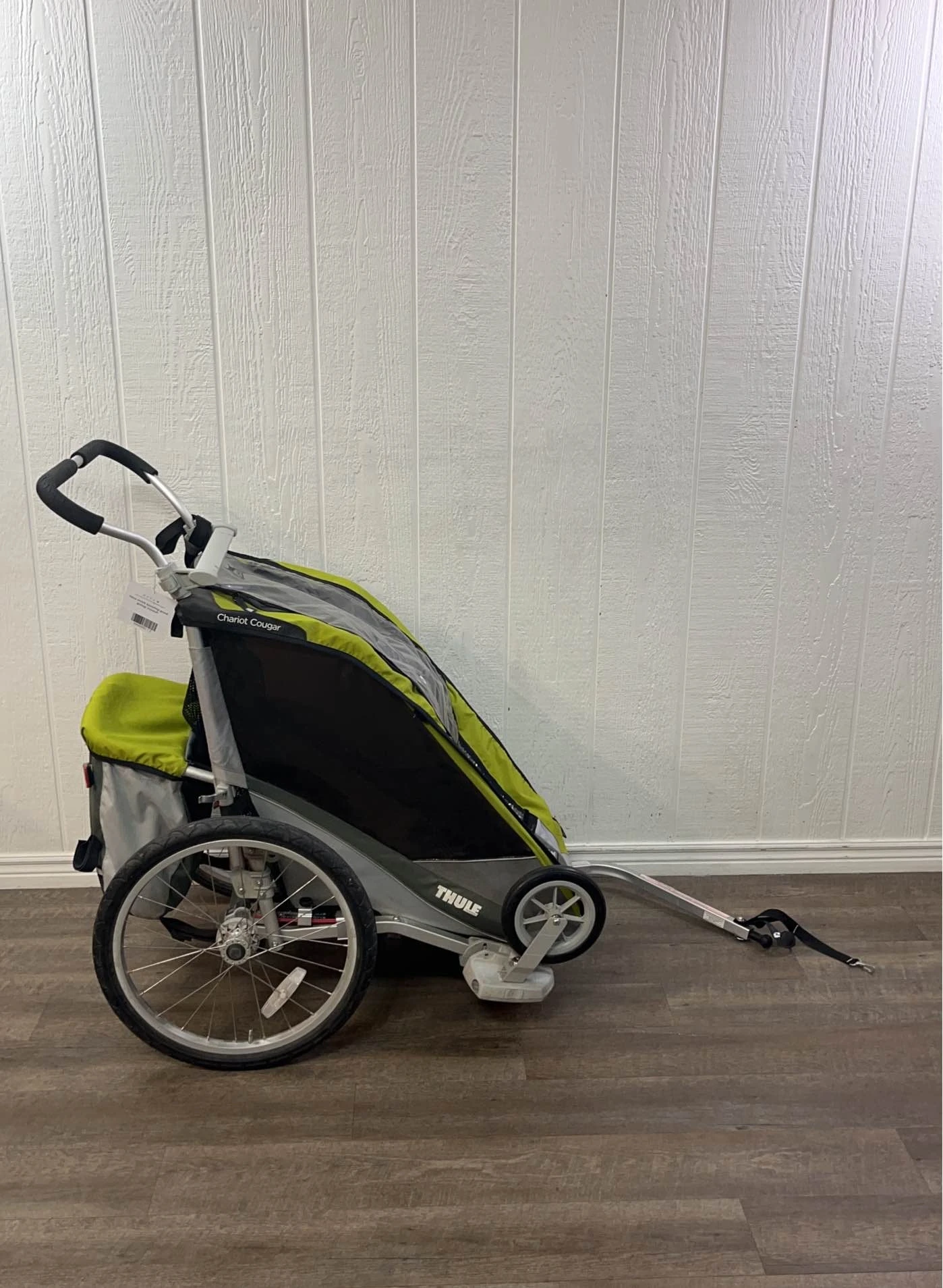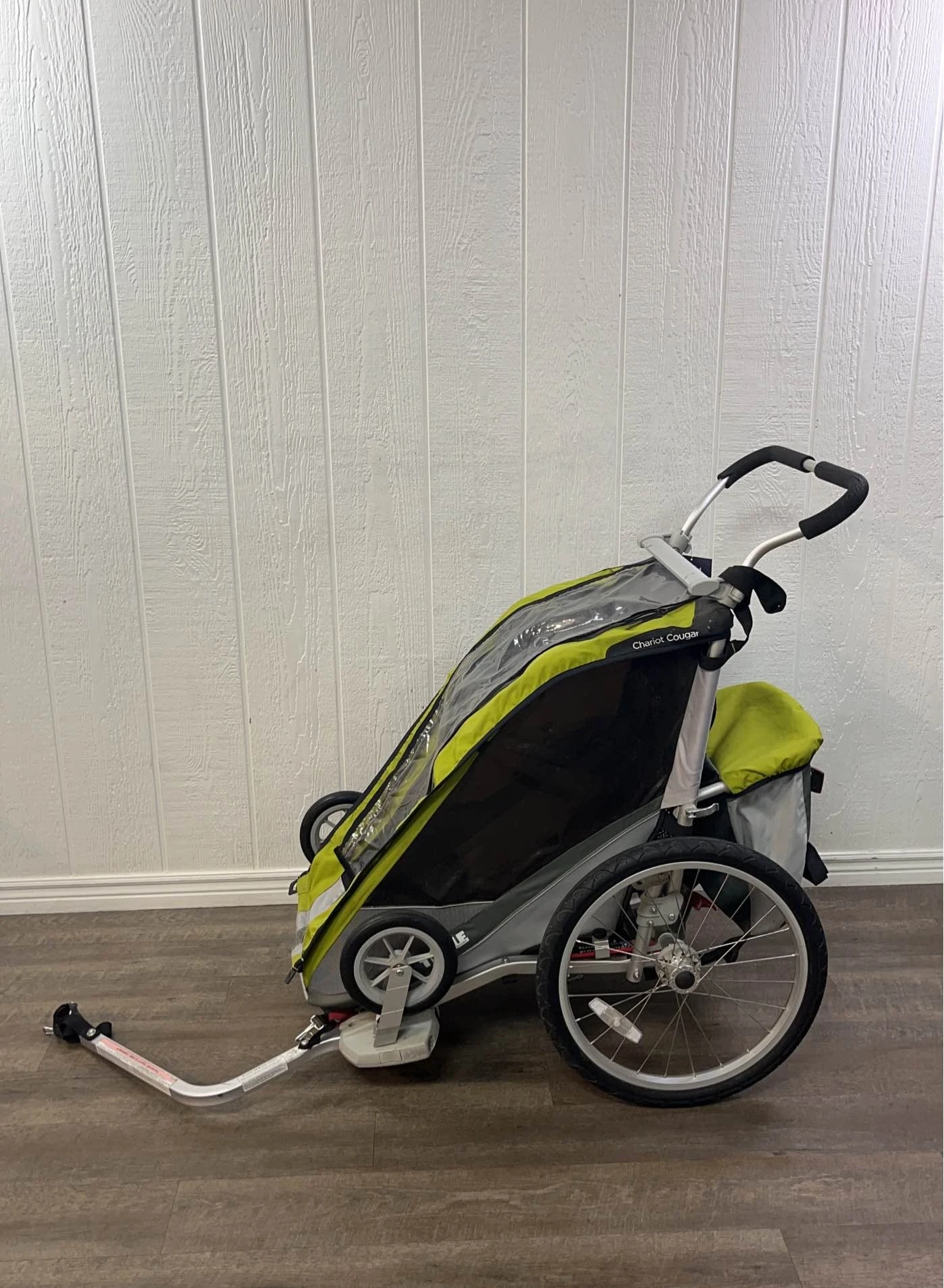 “The Chariot Cougar 1 is the top-of-the-line travel system when it comes to outdoor family adventures. Delight your children with a bike ride to the park, jog around the neighborhood, hike in the mountains, or a leisurely stroll through the local farmers market. This trailer does it all! Features a roll-back weather shield, adjustable handlebar, lightweight frame, safety flag, comfortable seats with padded 5-point harnesses, infant sling, jogging kit, and bike trailer attachment. Folds for easy transport.”