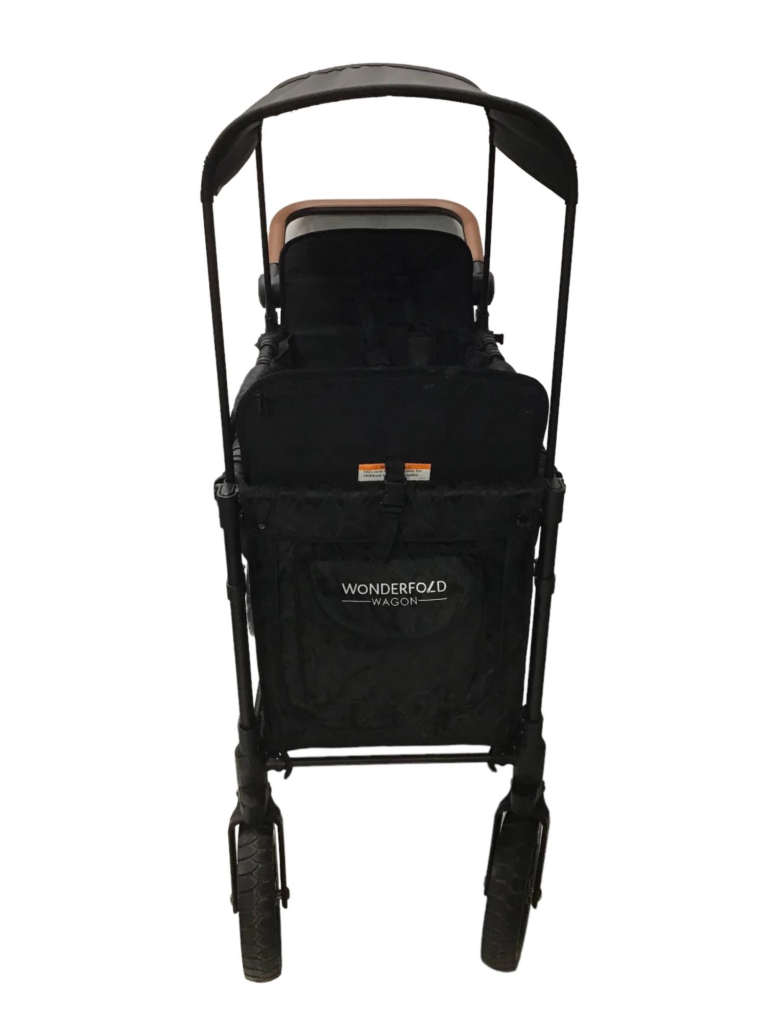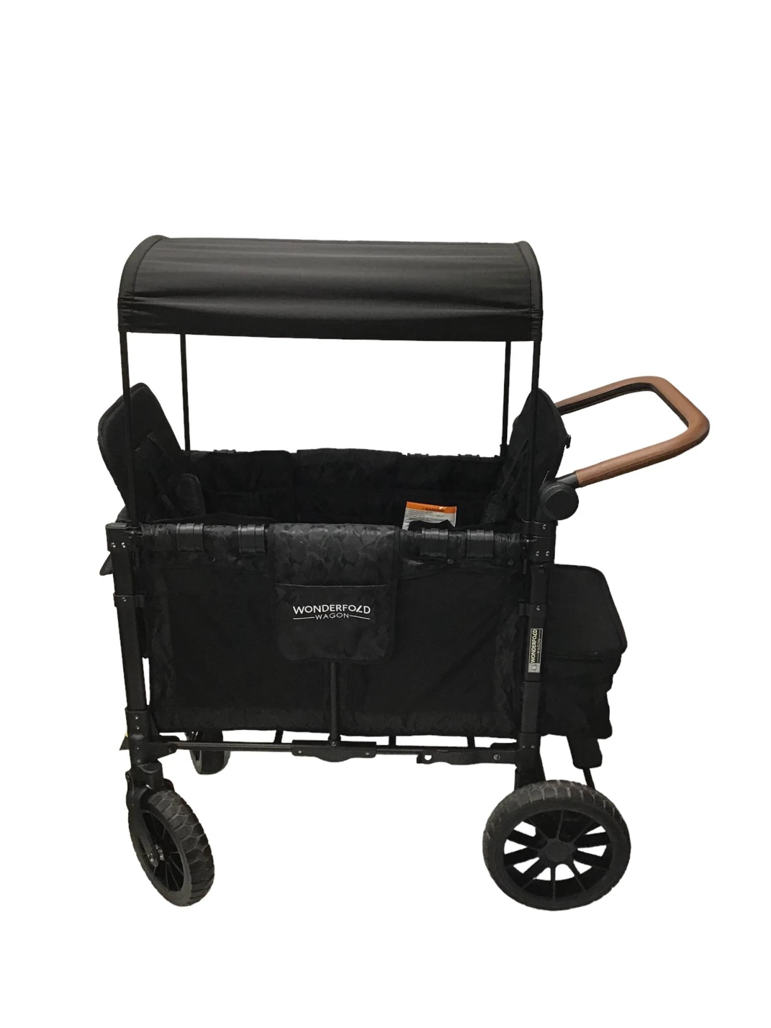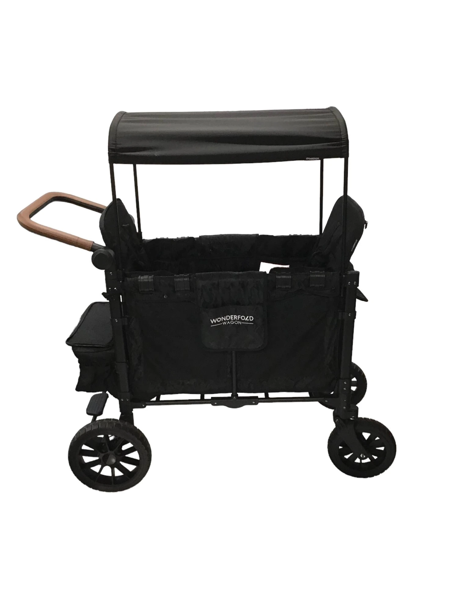 “This updated wagon is amazing! It can hold up to 2 kids and includes 5 point magnetic harnessed seats with a slidable/removable large canopy. If you want to use this wagon without seats, the seats are removable. This wagon has great updated features such as a front zipper for easy access, an adjustable push handle with vegan leather, a 1 step foot brake, all-terrain XL tires, and an amazingly small fold. This wagon holds up to 200 pounds and 45 pounds for each seat.”